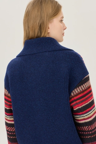 둥근 쉐입의 카라를 배색하여 러블리한 무드의 니트 가디건.