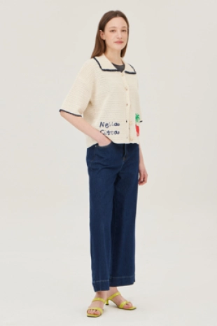둥근 쉐입의 카라를 배색하여 러블리한 무드의 니트 가디건.