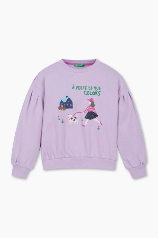 러블리한 픽셀 일러스트로 유니크한 프린트로 제안된 맨투맨 티셔츠.