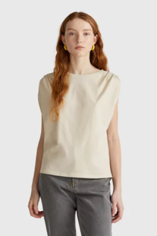 숄더 셔링 디테일로 내추럴한 주름이 여리한 실루엣을 연출함.