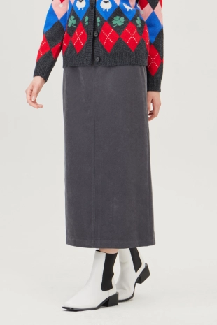 스웨이드 소재와 내추럴하게 플레어지는 A라인 백 밴딩 스커트.