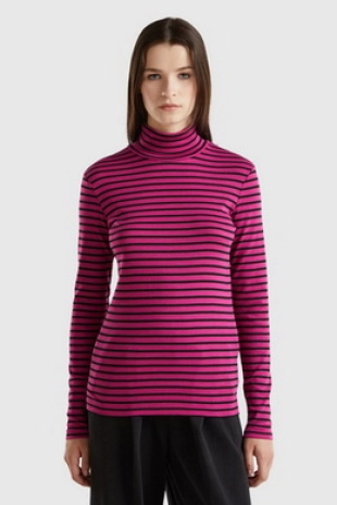 스트라이프 패턴으로 경쾌하게 제안된 하이넥 티셔츠.