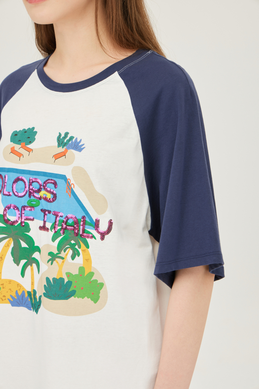 야자수 프린팅과 레터링 스팽글 장식으로 포인트를 준 티셔츠.