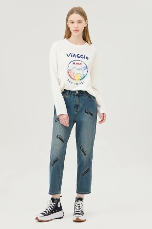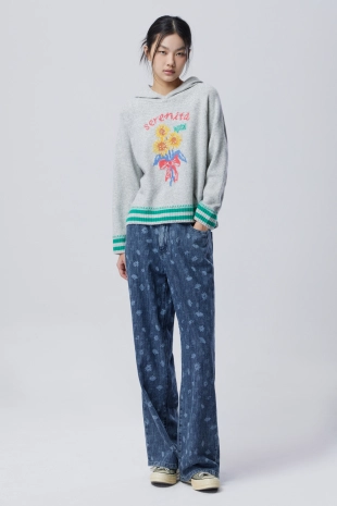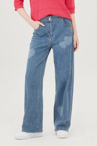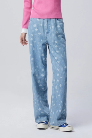 와이드한 핏으로 트렌디한 무드를 연출하는 데님 팬츠.