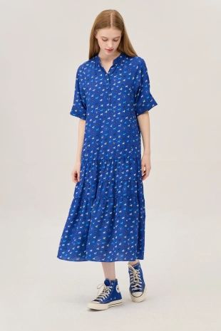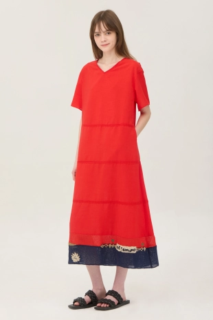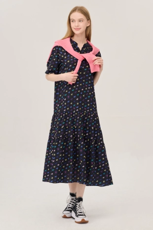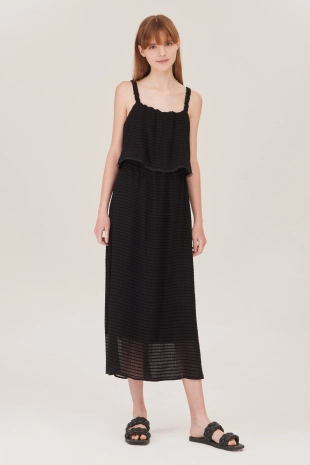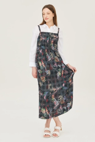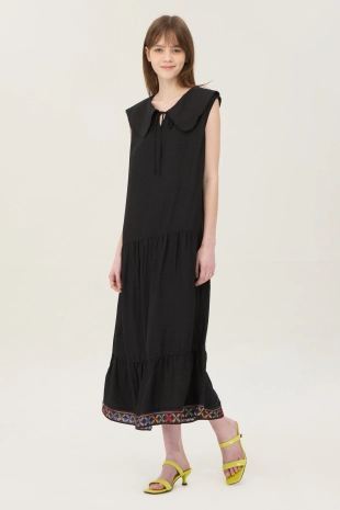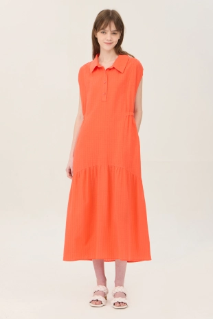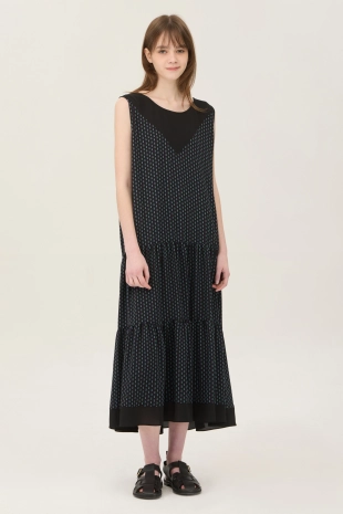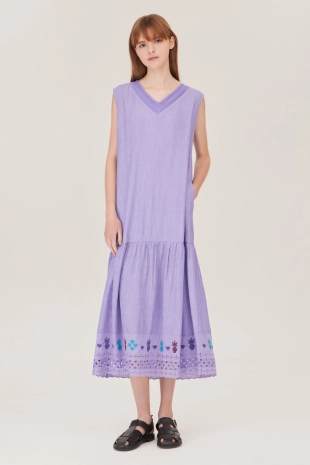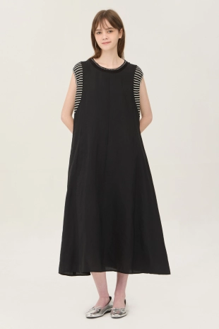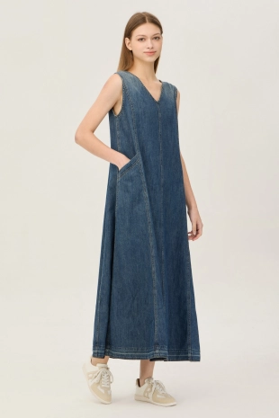발랄하고 캐주얼한 무드가 느껴지는 슬리브리스 데님 롱 원피스.