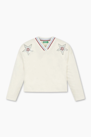 유니크한 컬러감이 돋보이는 스팽글 디테일의 맨투맨 티셔츠.