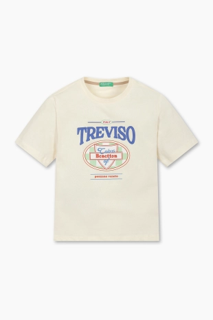 배색 프린팅과 입체감있는 오브제로 포인트를준 반팔 티셔츠.
