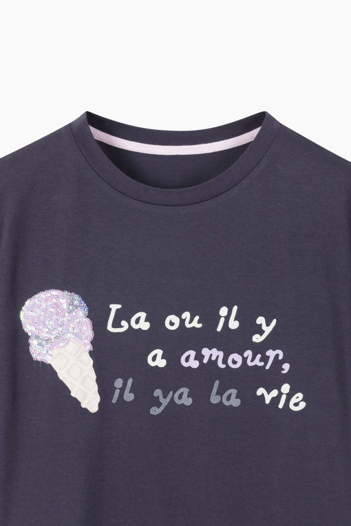 아이스크림 스팽글과 레터링 프린팅으로 포인트를 준 티셔츠.