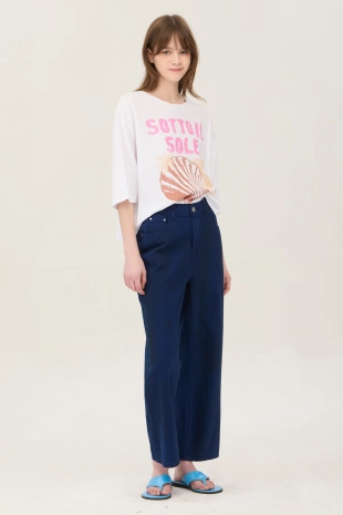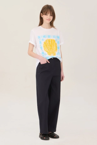 앞면에 페이크 포켓 디테일을 더한 통 일자핏 해지 데님 팬츠.