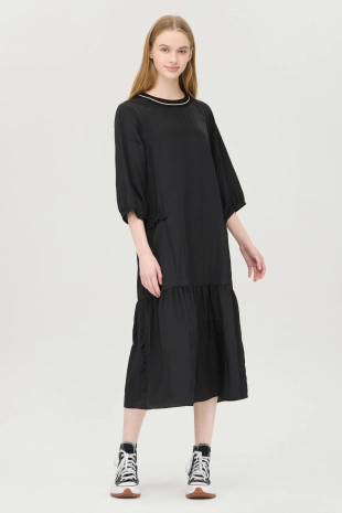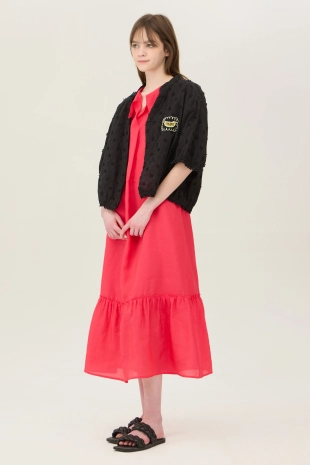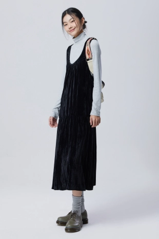 하단에 셔링을 더해 입체감을 살렸으며, 페미닌한 무드를 연출함.
