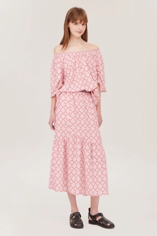 하단에 셔링을 더해 입체감을 살렸으며, 페미닌한 무드를 연출함.