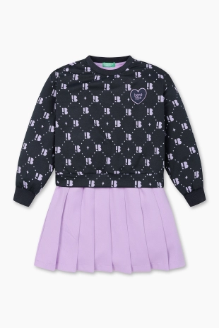 자수 레터링 디테일과 플레어 스커트 라인이 포인트.