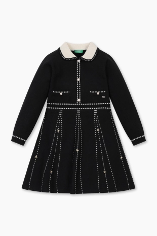 컬러블럭에 스티치 쟈가드가 포인트인 니트 카라 원피스.