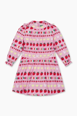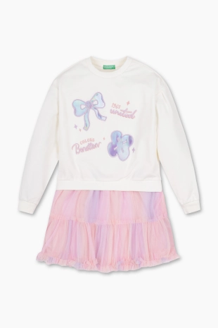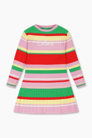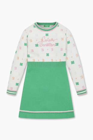 패턴 프릴 스커트의 컬러감이 돋보이는 우븐 니트 원피스.