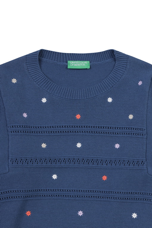 플라워 배색 자수가 돋보이는 크롭 반팔 니트 풀오버.