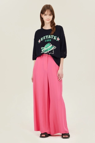 링클 디테일로 내추럴한 무드를 연출하는 와이드핏 밴딩 팬츠.