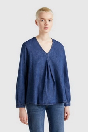 깊은 브이넥 라인이 돋보이는 스타일리시한 데님 블라우스.