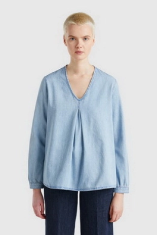 깊은 브이넥 라인이 돋보이는 스타일리시한 데님 블라우스.