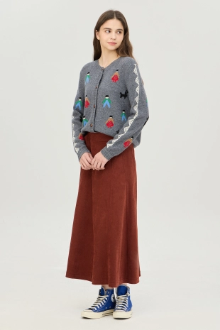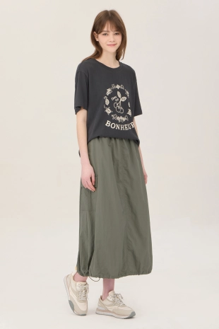 허릿단 전체 밴딩으로 착장이 편안하며, 프릴 디테일로 포인트를 줌.