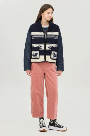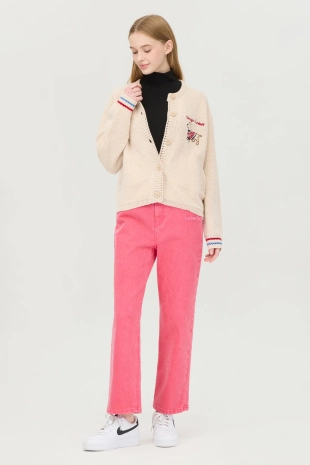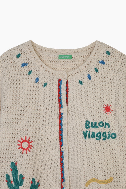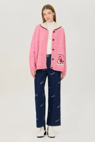 배색 라인과 다양한 모티브로 경쾌한 디테일을 살린 니트 가디건.