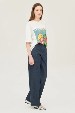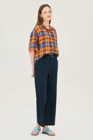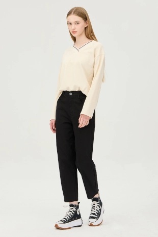 턱 디테일로 포인트를 준 베이직한 디자인의 일자 팬츠.