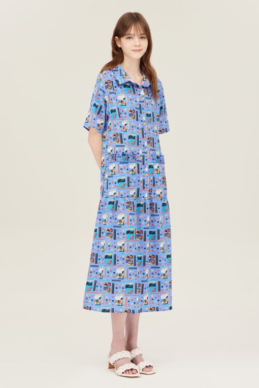 유니크한 올오버 패턴으로 포인트를 준 A라인 롱 원피스.