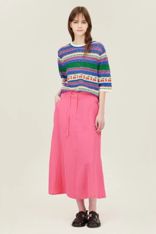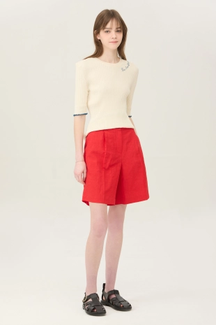 배색 물결 마감 디테일이 돋보이는 슬림핏 골지 반팔 니트.