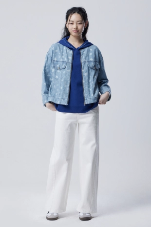 모크넥 디자인에 프레이드 마감으로 포인트를 준 데님 점퍼.