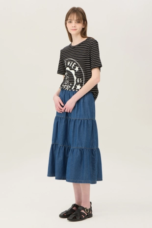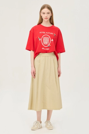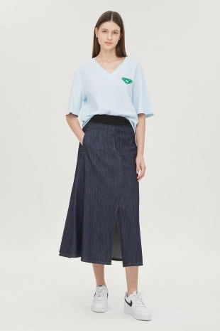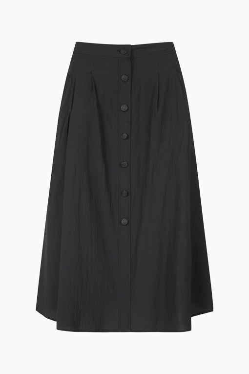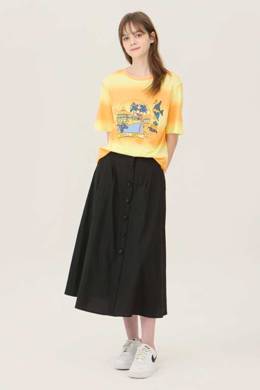 센터의 버튼과 투 턱 디자인으로 포인트를 준 롱 스커트.
