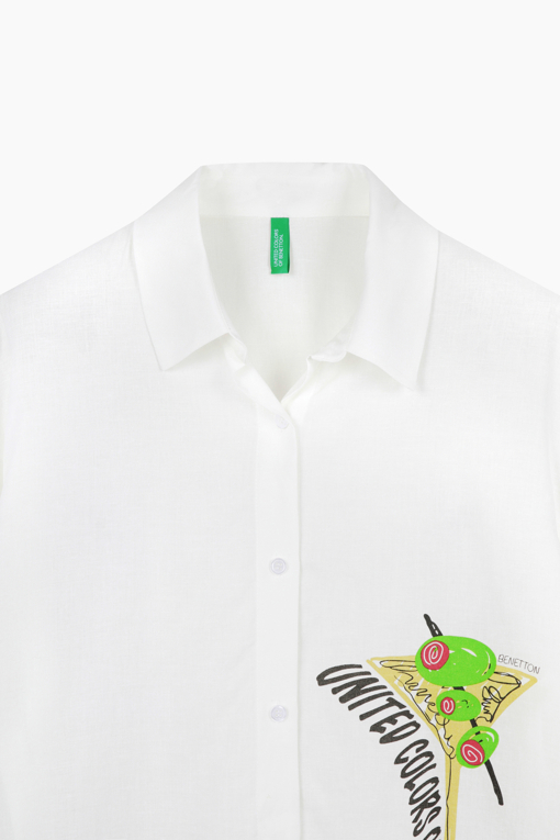 칵테일 모티브의 배색 프린팅으로 포인트를 준 블라우스.