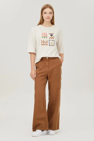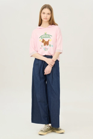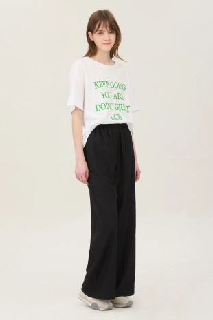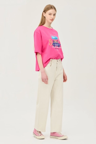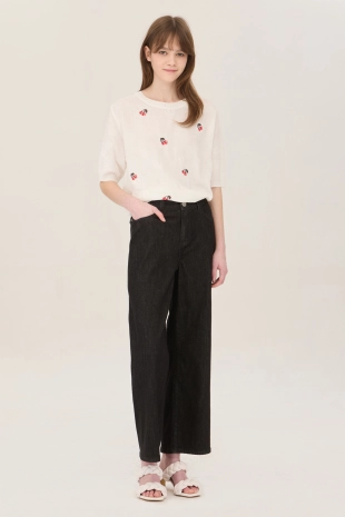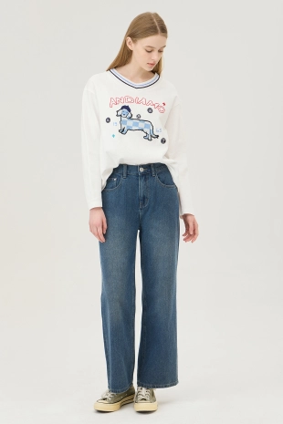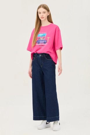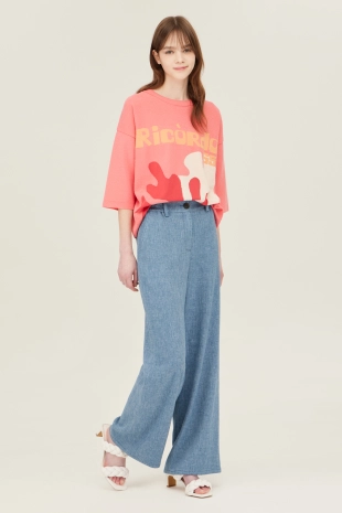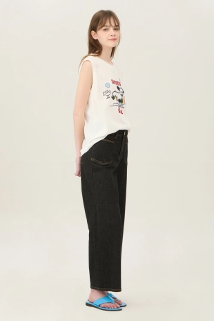 사선 테이프 로고 프린팅으로 포인트를 준 와이드 데님 팬츠.