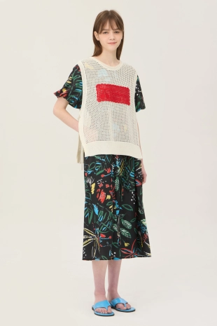 배색 자수 패치가 돋보이는 메쉬 짜임의 니트 베스트.