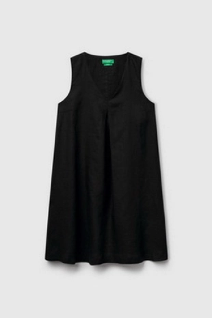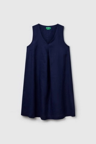 딥한 브이넥에 A라인으로 제안된 린넨 슬리브리스 원피스.