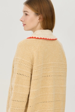 각 끝단을 프릴 마감하여 러블리한 무드를 연출하는 니트 가디건.