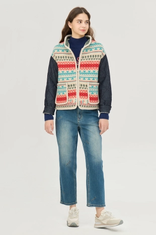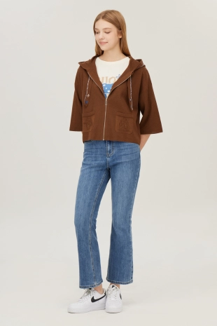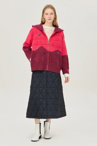 배색 컬러감의 메쉬 후드로 포인트를 준 집업 니트 가디건.