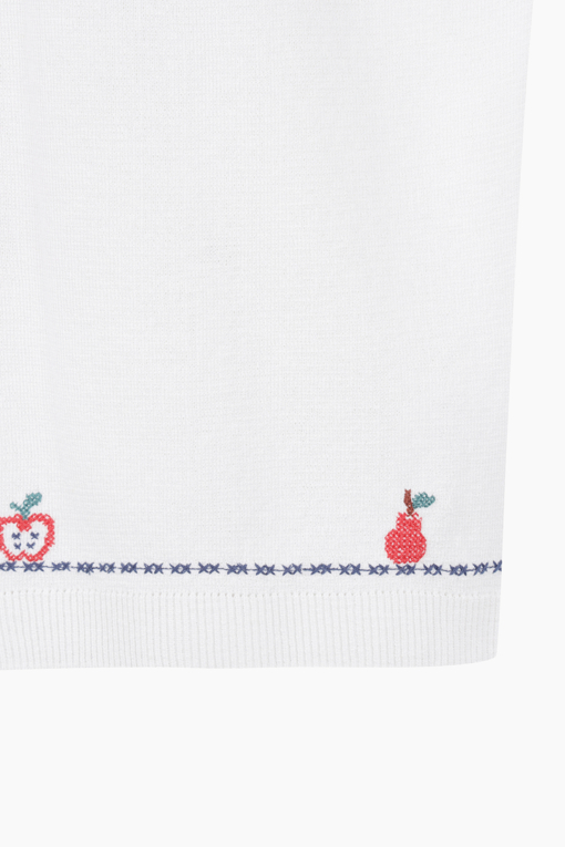 배색 래글런 슬리브와 다채로운 자수로 포인트를 준 반팔 니트.