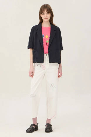 사각 포켓에 은은하게 반짝이는 로고 자수로 포인트를 준 자켓.