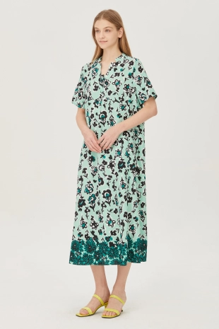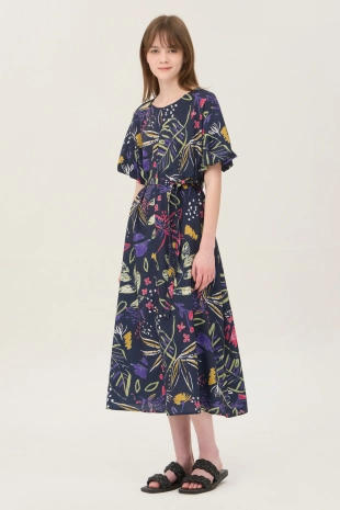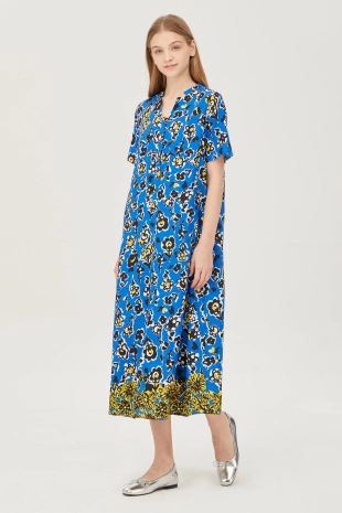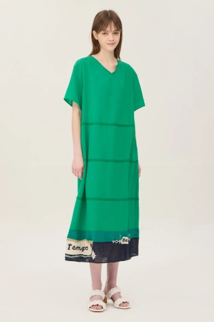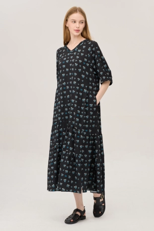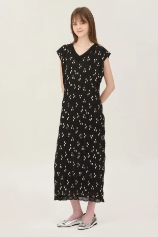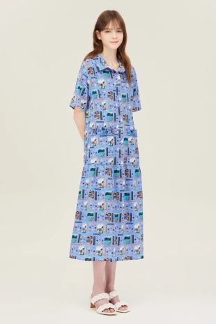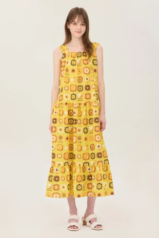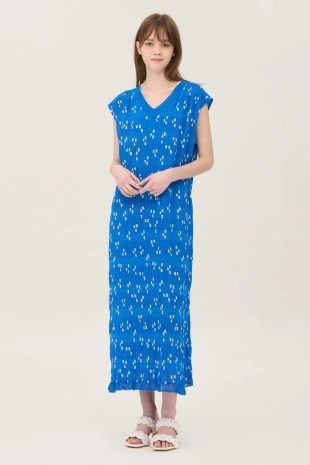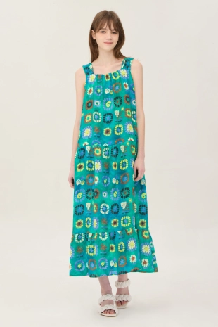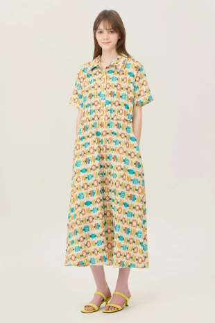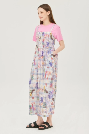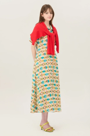 스모킹 디테일과 다채로운 컬러 패턴이 돋보이는 롱 원피스.