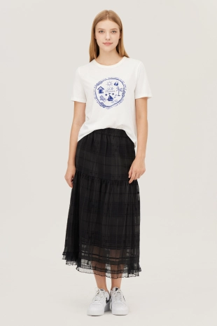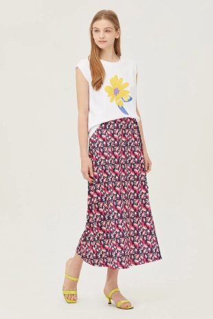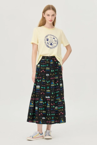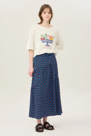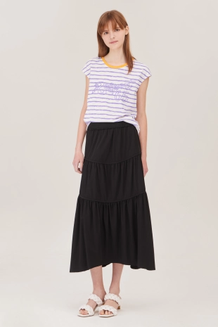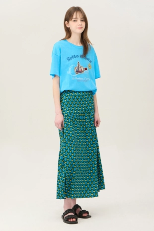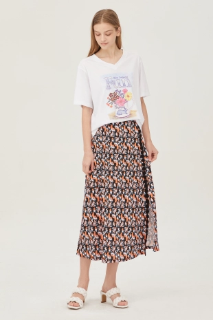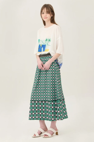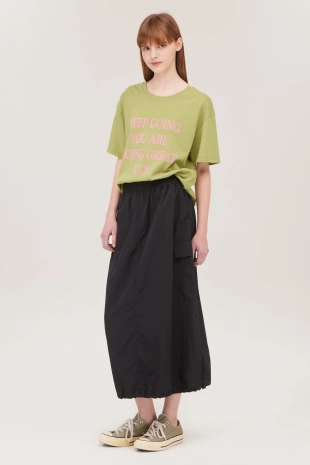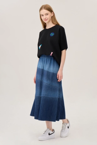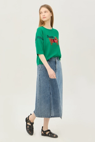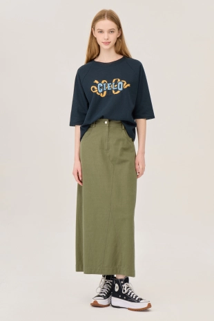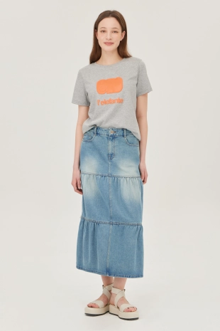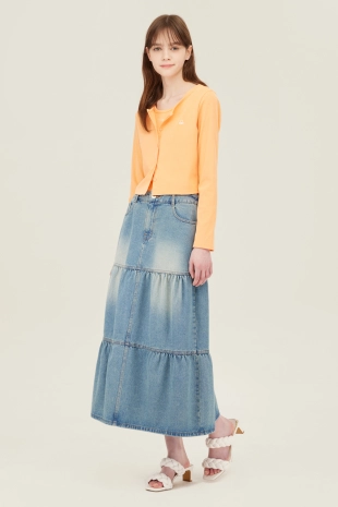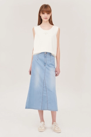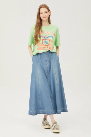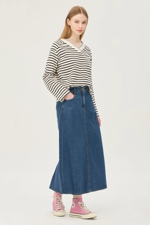 와이드한 패치 포켓 디자인으로 포인트를 준 데님 스커트.