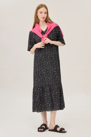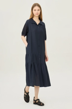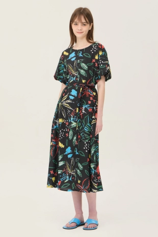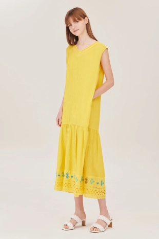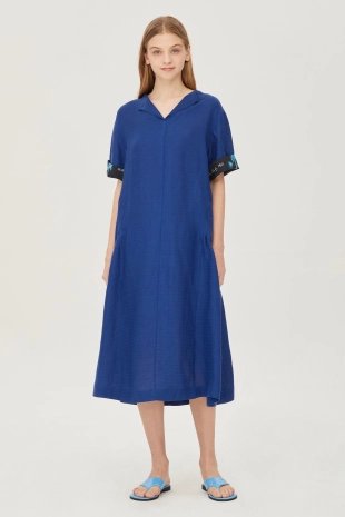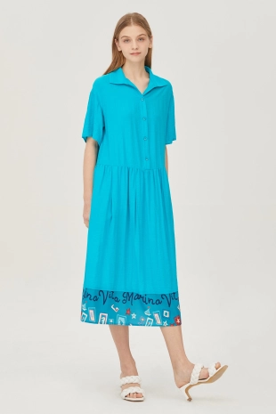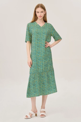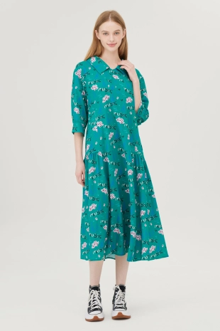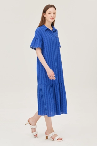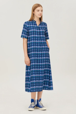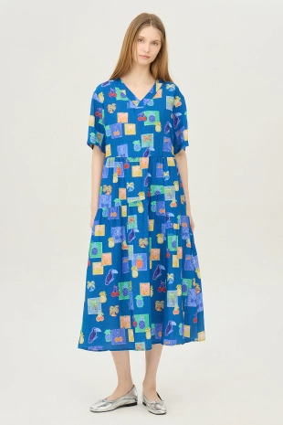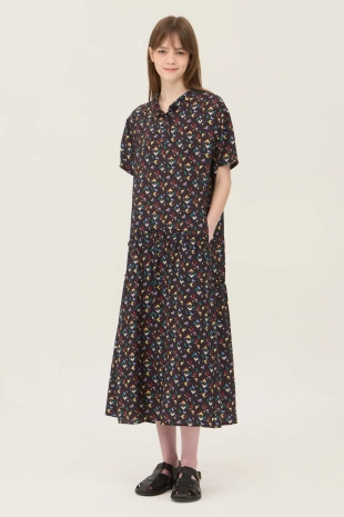 스모킹 디테일과 다채로운 컬러 패턴이 돋보이는 롱 원피스.