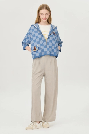 돛단배 모티브의 배색 자수로 포인트를 준 니트 가디건.