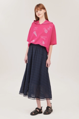 부분 블록 메쉬 소재와 배색 자수 라인이 돋보이는 후드 니트.