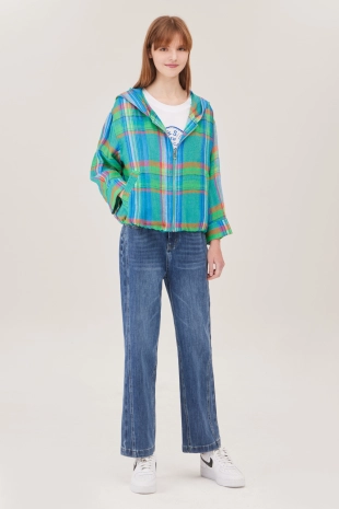 후드와 앞면 센터의 니트 레이어 디자인이 매력적인 블라우스.