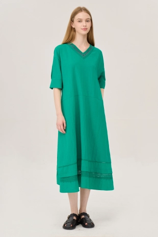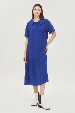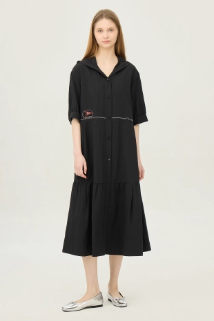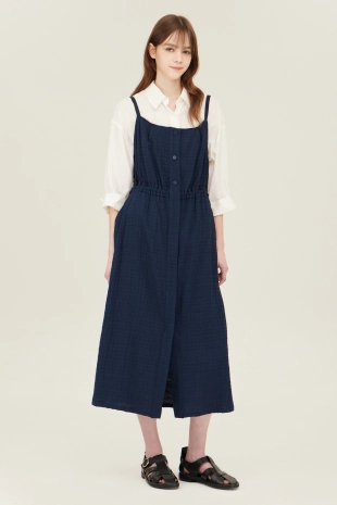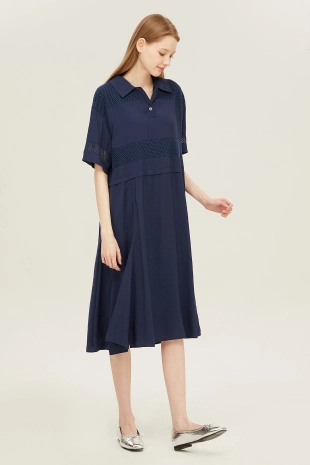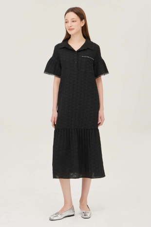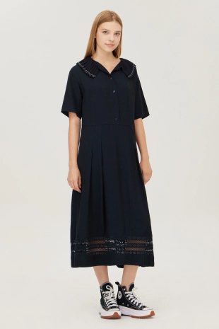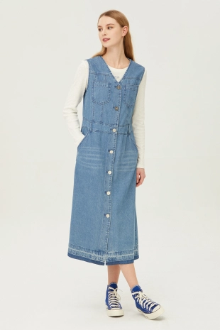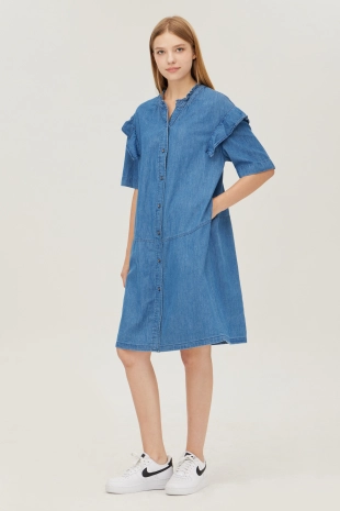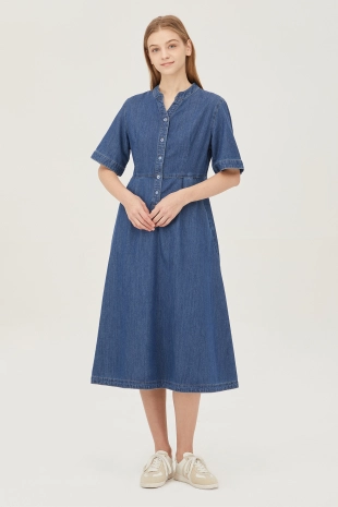 레이스로 마감된 숄 카라 디자인으로 러블리한 무드의 데님 원피스.