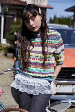 체리 크로셰를 패치하여 귀엽게 디테일을 살린 니트 풀오버.