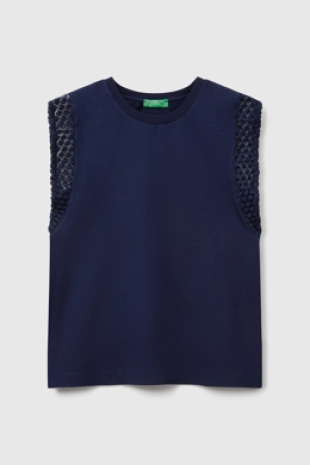 플라워 패턴의 메쉬 마감된 슬리브 라인이 포인트인 티셔츠.