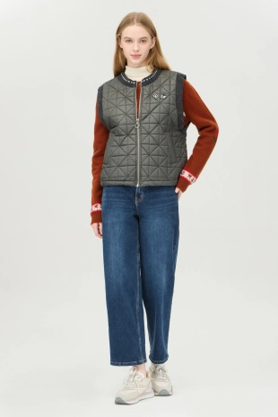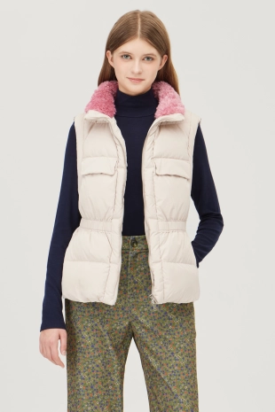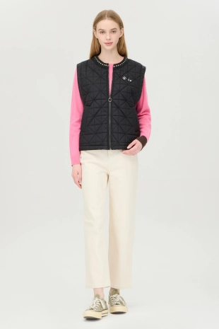 뒷면에 강아지 자카드로 포인트를 준 니트 블록 다운 베스트.