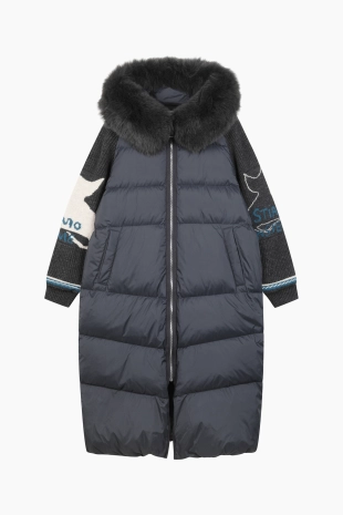 니트 소재가 블록된 유니크한 무드의 덕다운 점퍼.