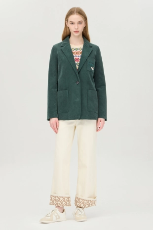 센터 풀 버튼으로 착장이 간편하며, 깔끔한 아웃핏을 연출함.