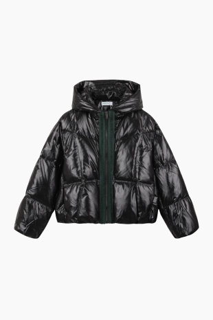 플라켓 부분에 컬러 니트 테이핑으로 포인트를 준 숏 다운.